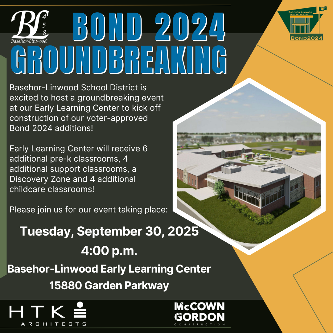 Basehor-Linwood School District is excited to host a groundbreaking event at our Early Learning Center to kick off construction of our voter-approved Bond 2024 additions!